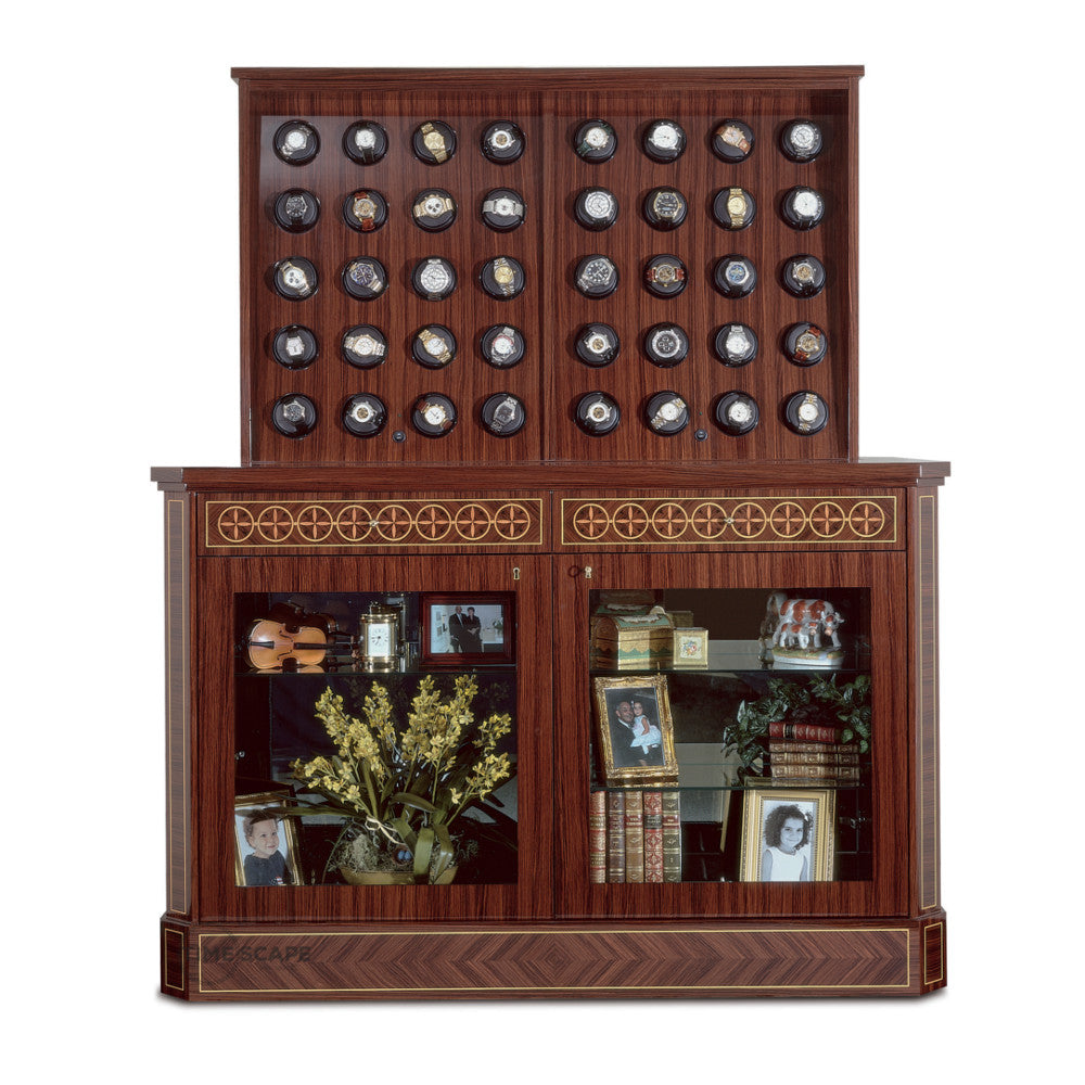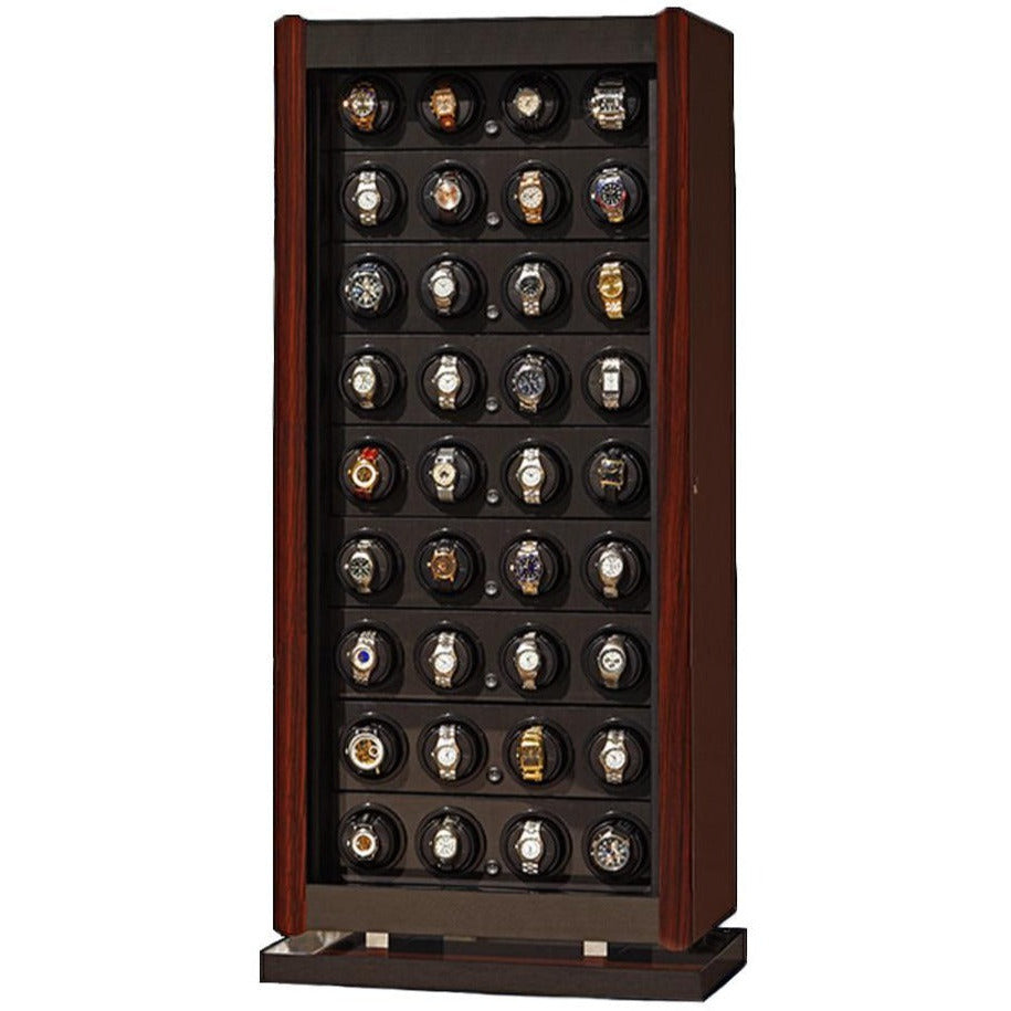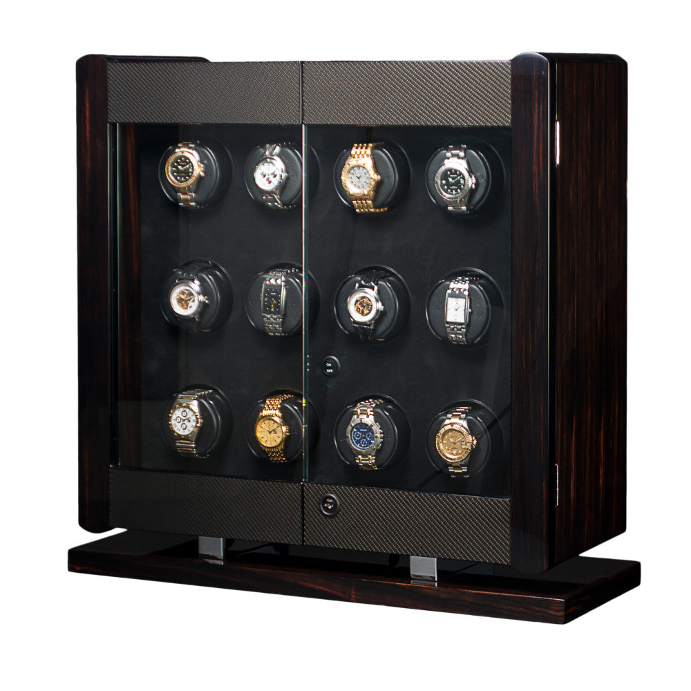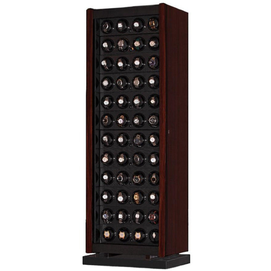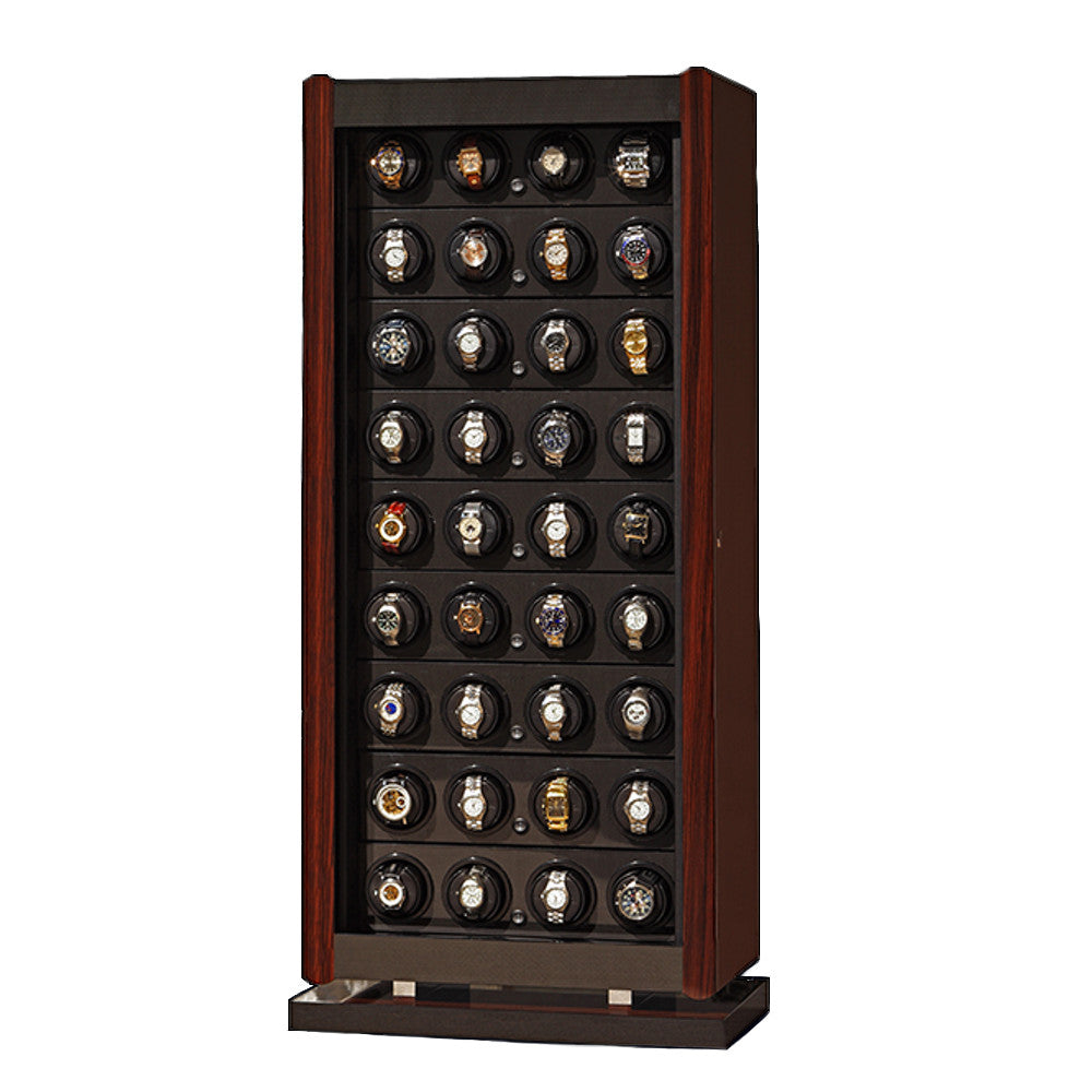 The classic "RotoBox" Collection from the Underwood of London brand is manufactured in Italy and powered by a Swiss motor to keep your automatic watches in optimum working order. The UN844 series comes in a variety of sizes, materials and colors with patented Maxon A-max DC motors. The reliable, high-performance low energy consuming watch winding system has a quite low noise output. The modular frame is composed of a fine calf skin leather exterior with twenty removable watch winders secured and protected behind a key lockable glass door. Powered by batteries or optional power supply cord with USB cable to customize your winding program.