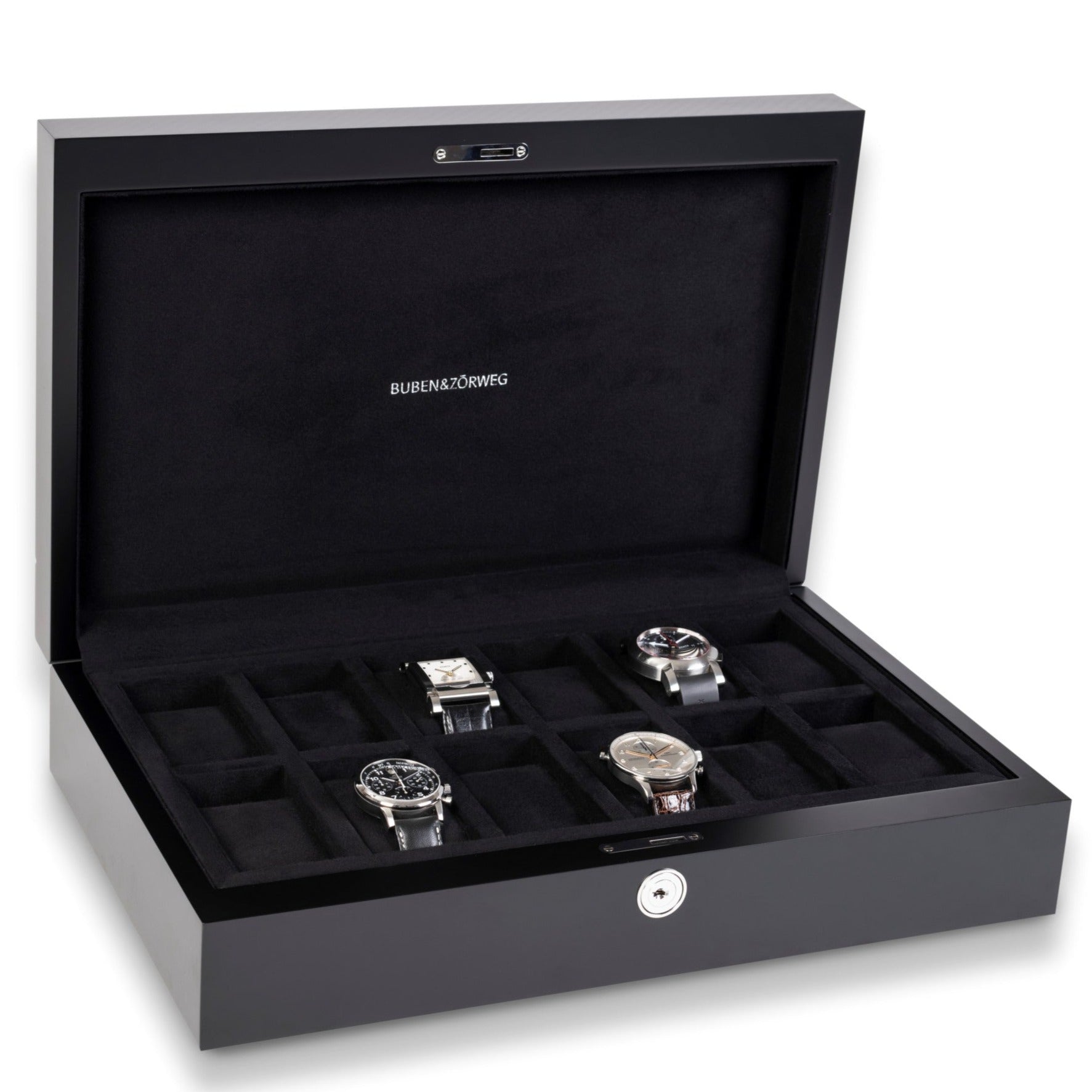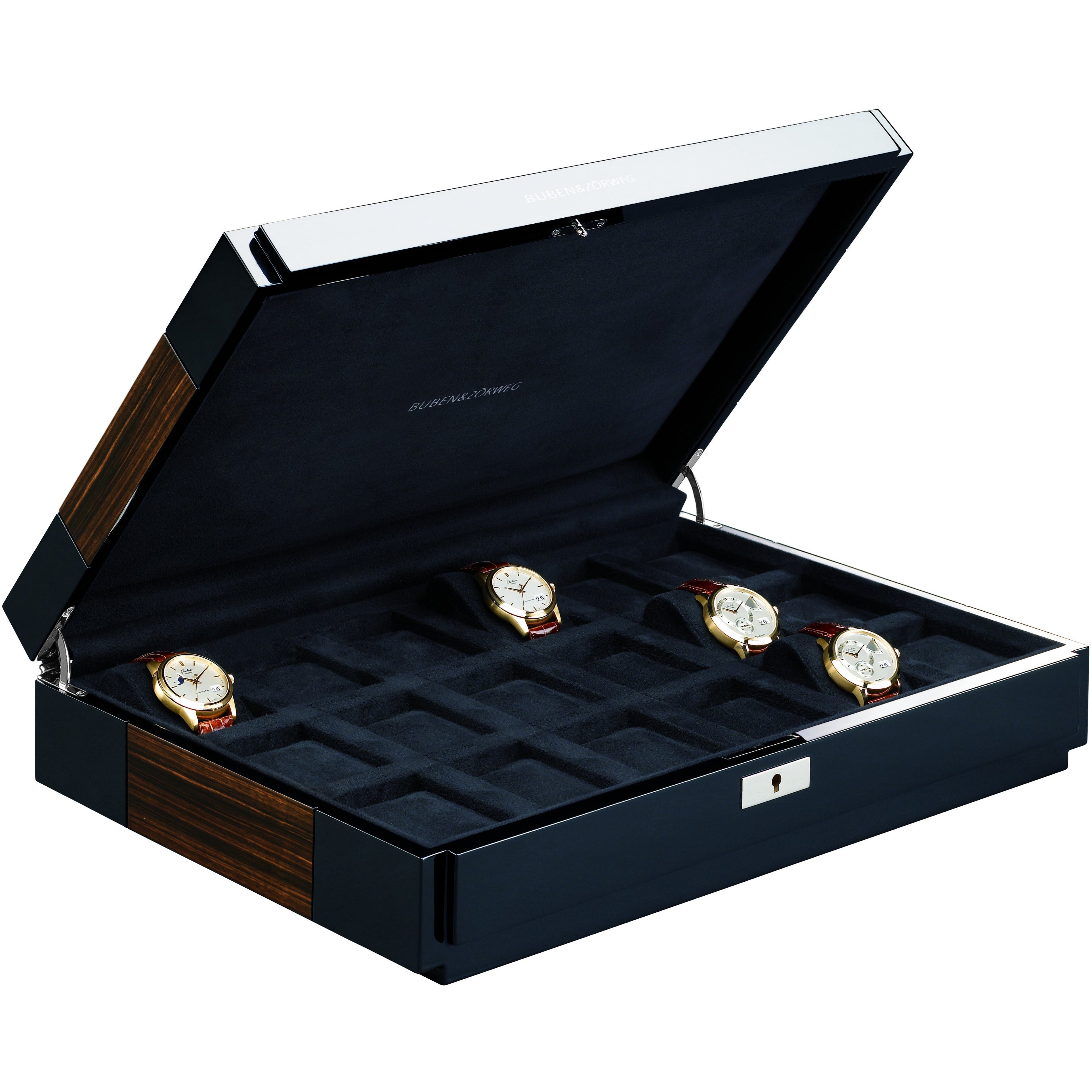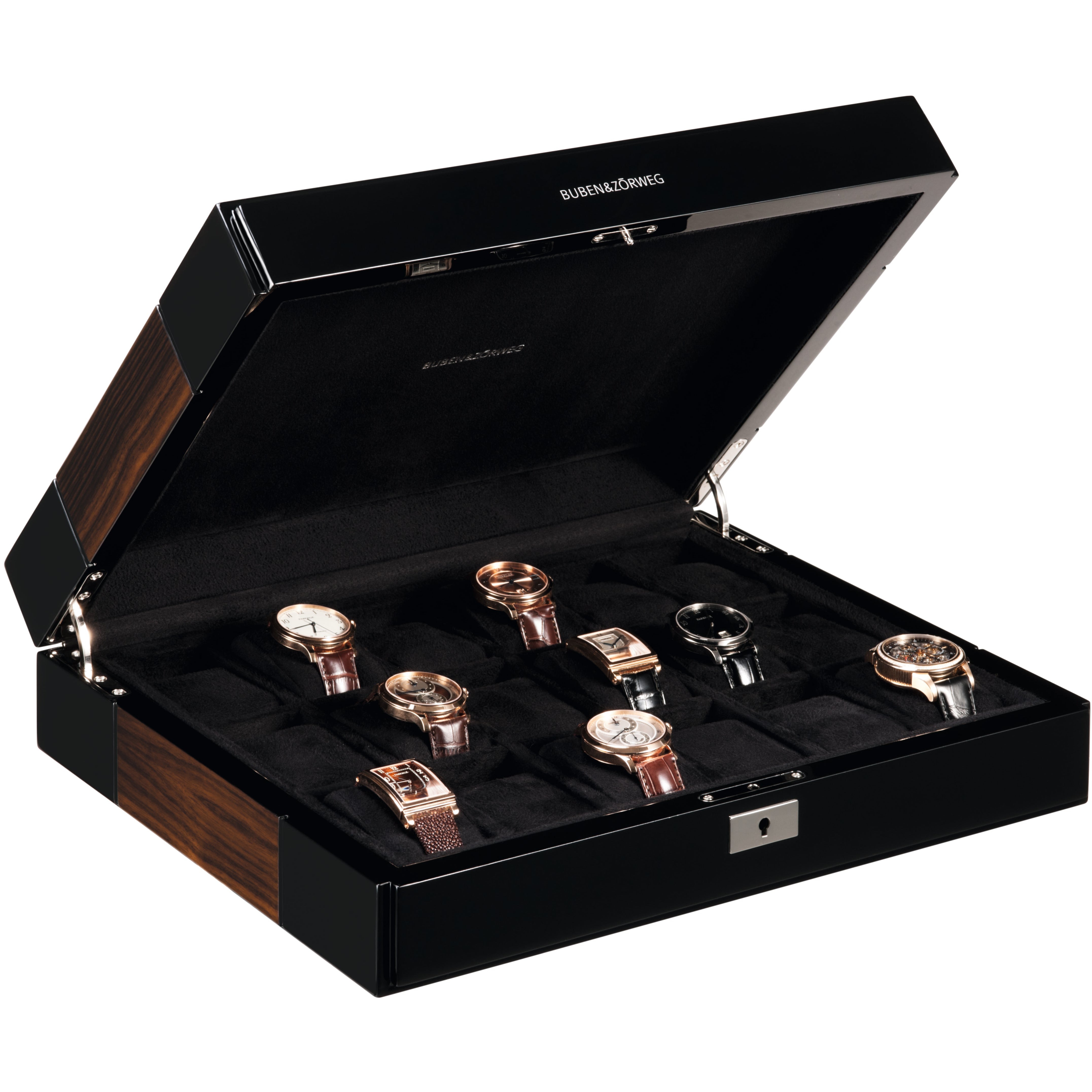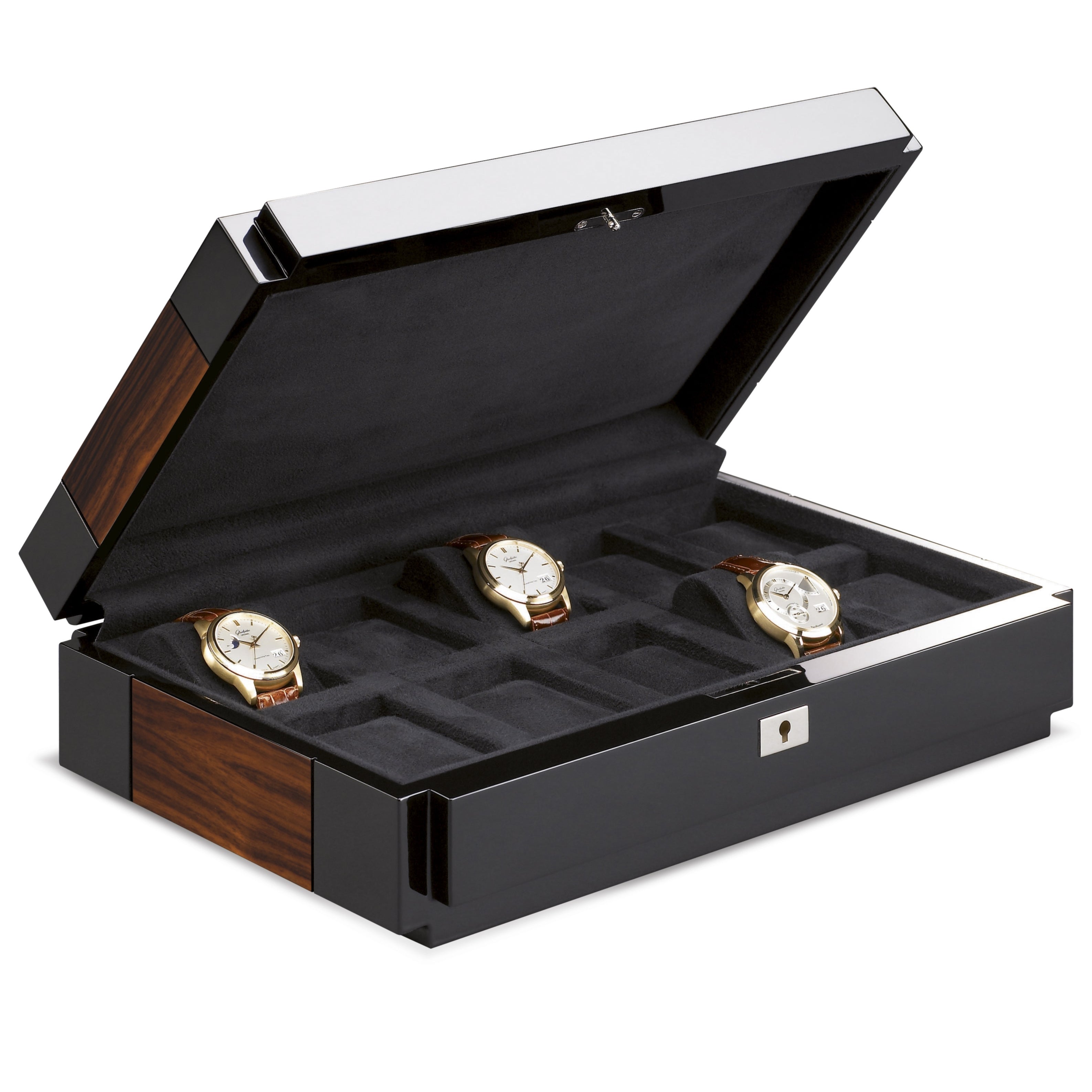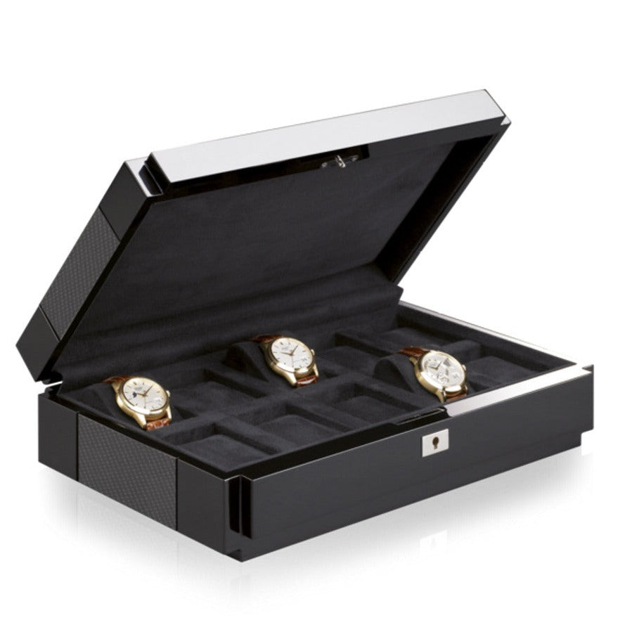 The Heritage Series by Rapport of London is a collection of quality lockable watch and storage containers in exotic colorful woods and finishes. Watch box L281 is a sixteen unit watch case finely crafted in walnut burlwood, hand finished with eight coats of high gloss veneer lacquer. The quadrant hinged lid is key lockable and fitted with polished chrome hardware to safely store and keep your valuable timepiece collection secure. The interior has two level storage with removable tray lined in soft velveteen finish with individual compartments, soft padded watch cushions to keep your collection protected and in place.